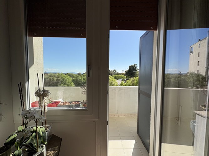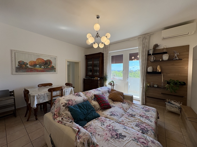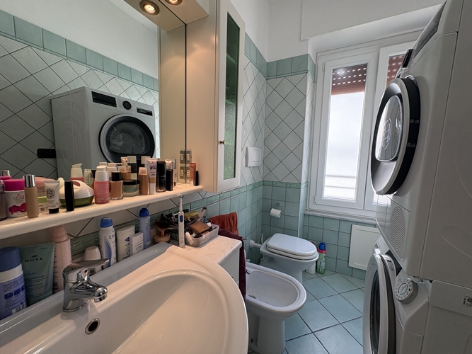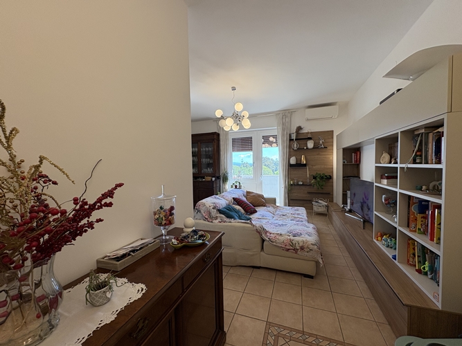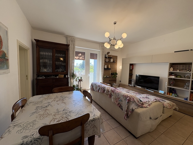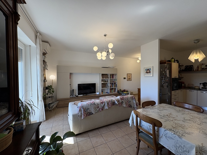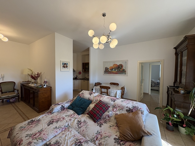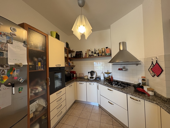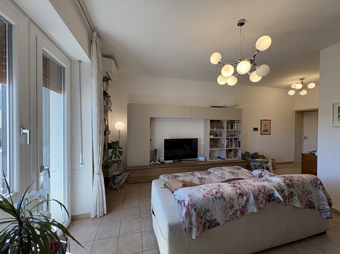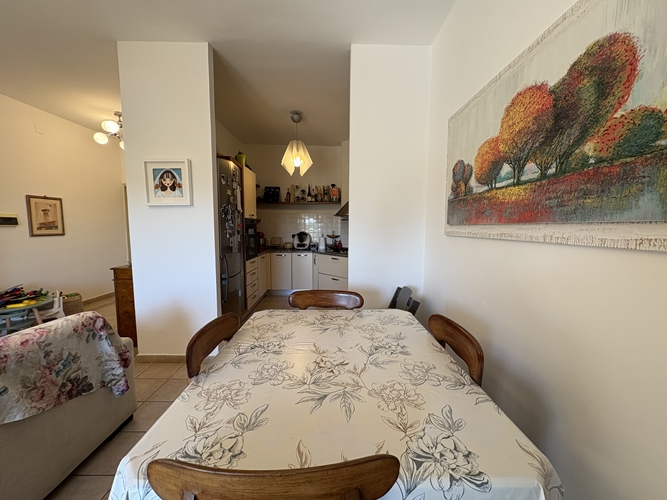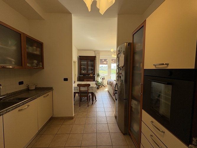 L’ingresso si apre direttamente su una spaziosa zona giorno, particolarmente luminosa, suddivisa in area relax e zona pranzo, con accesso diretto a un comodo balcone che affaccia sul cortile interno. La cucina, leggermente separata, è pratica e ben organizzata.