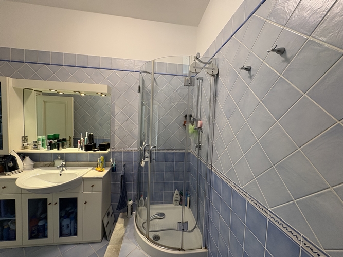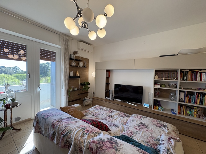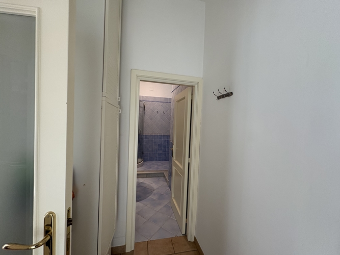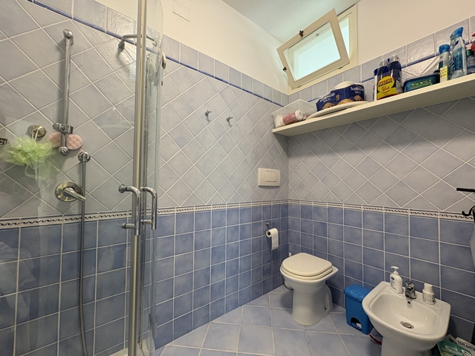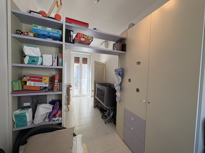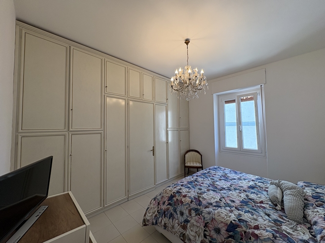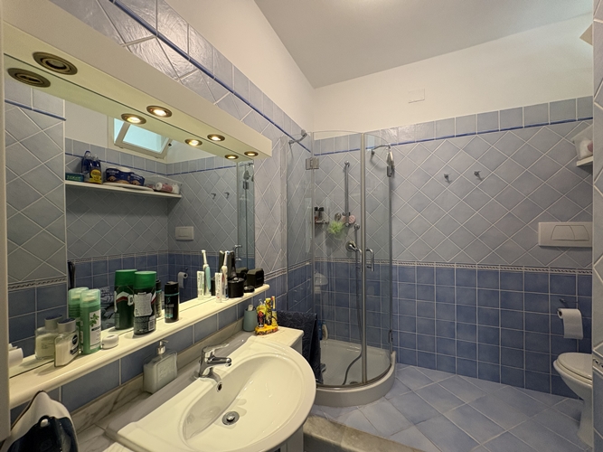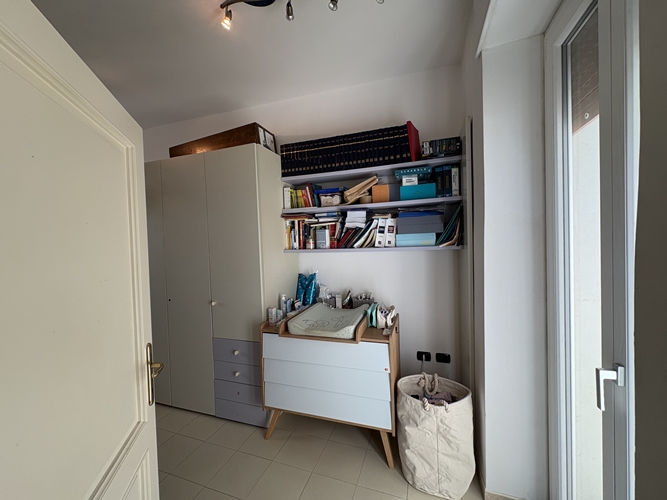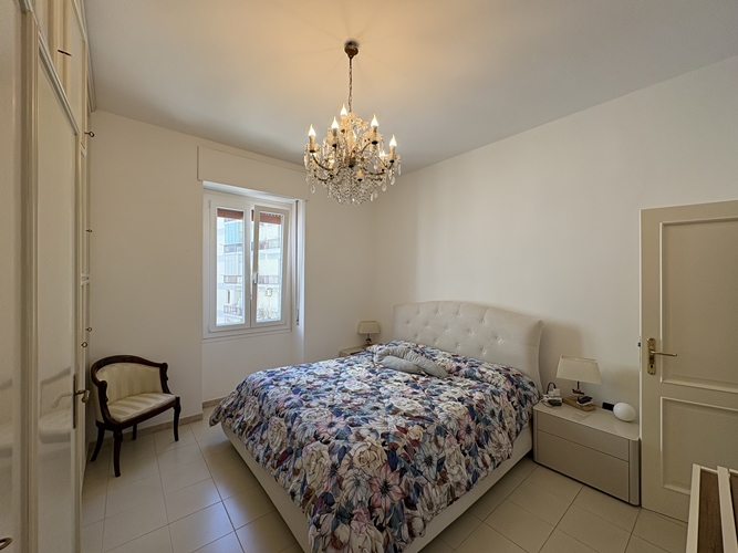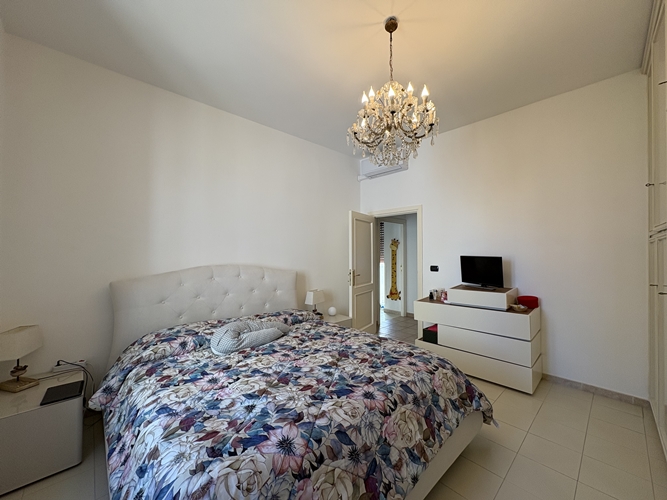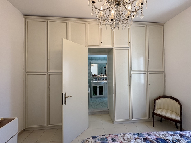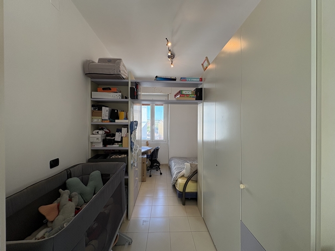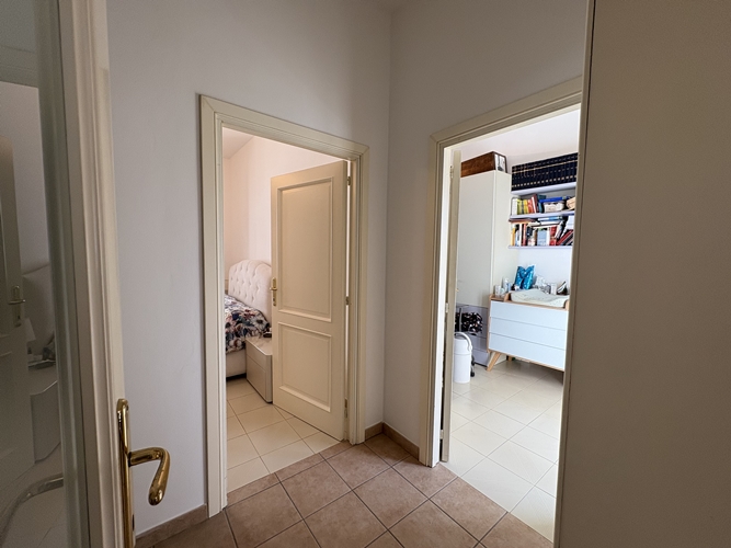 La zona notte, ben separata, comprende una camera matrimoniale ampia e accogliente, dotata di bagno privato perfettamente integrato con l’armadiatura, una seconda camera da letto di dimensioni più contenute e un secondo bagno, spazioso e completo di box doccia.
