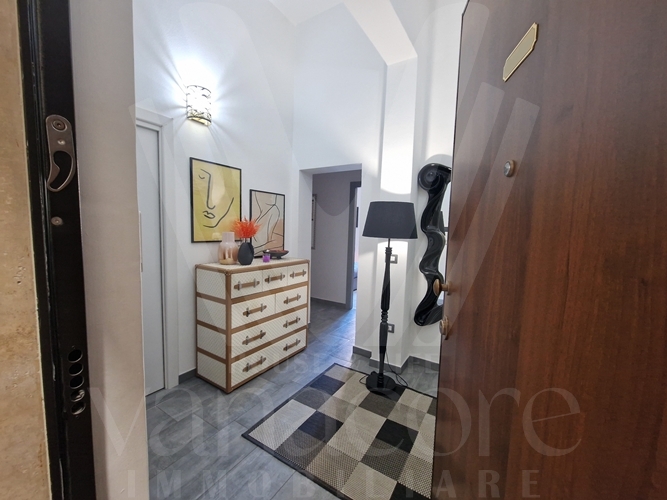 L’ingresso conduce a un comodo disimpegno che si apre su una spaziosa e luminosa zona giorno, caratterizzata da un ambiente accogliente e ben organizzato, suddiviso in zona relax e zona pranzo. La cucina a vista, impreziosita da un’elegante isola centrale, si integra perfettamente con lo spazio. Questa zona giorno gode di un’ottima luminosità grazie all’uscita su un pratico balconcino e alla presenza di due finestre che si affacciano sul pozzo luce interno, garantendone la luce.