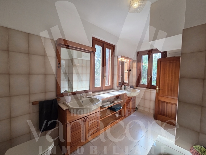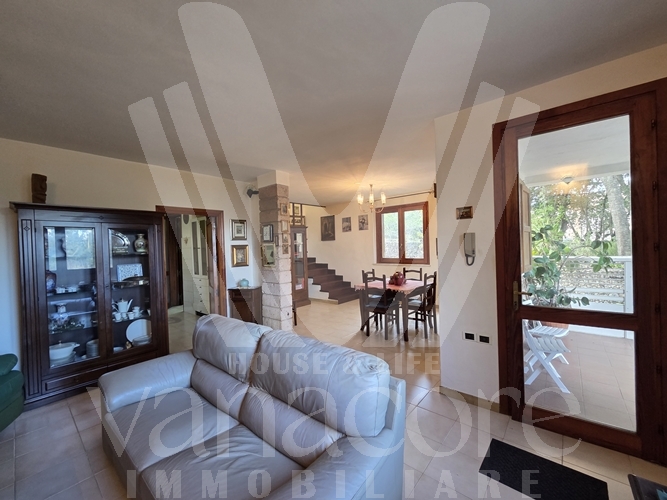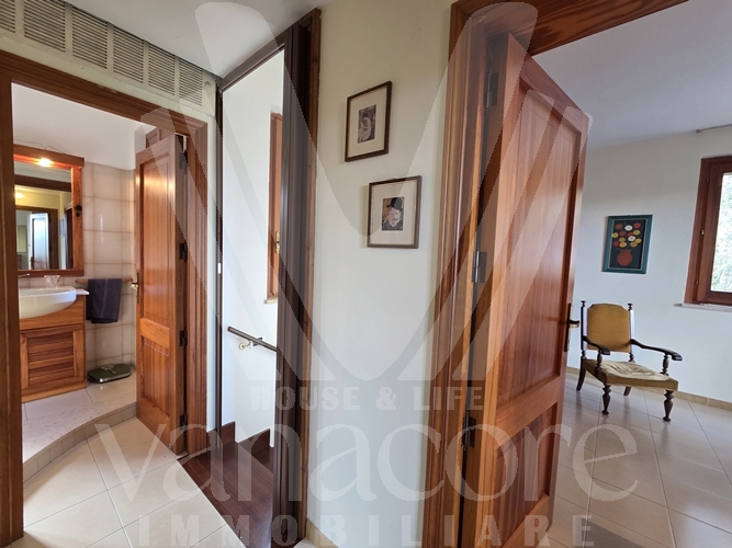 La villa si sviluppa su due livelli fuori terra e si distingue per la luminosità degli ambienti e la funzionalità degli spazi interni. Al piano terra si apre la zona giorno, caratterizzata da un ampio salone con camino e grandi superfici finestrate che garantiscono continuità tra gli interni e il verde circostante. Adiacente si trova la zona pranzo, in comunicazione con la cucina abitabile che, grazie a un’uscita indipendente, conduce a un pratico cavedio utilizzabile come locale di servizio, questo spazio offre più accessi verso l’esterno.