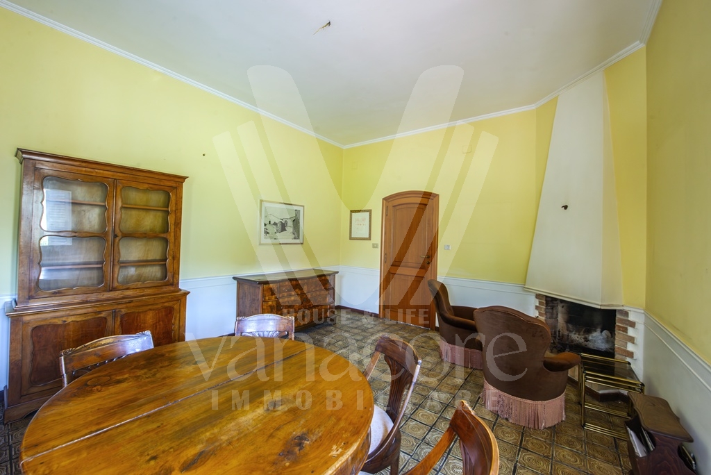 La sala da pranzo, accogliente, luminosa e anch’essa dotata di caminetto, si apre su un portico posteriore con vista e accesso sul giardino.