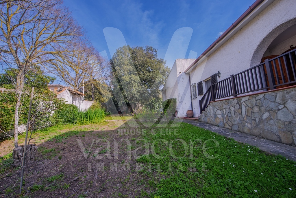 Dalla camera da pranzo si accede alla cucina tramite un ambiente intermedio che le fa da supporto e con apertura sul giardino. La cucina, completamente separata e funzionale, è collegata a due camere e a un bagno di servizio, offrendo così una zona indipendente e riservata.